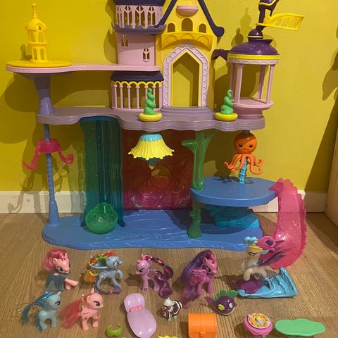 My Little Pony legetøjsslot med tilhørende figurer. Slottet har flere etager og tårne, designet til leg og opbevaring af My Little Pony figurer. Figurenes antal og farver varierer, og de er lavet i plastmateriale. Velegnet til børn til fantasifuld leg.