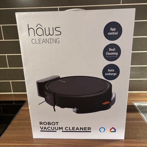 Hâws Cleaning Robot Vacuum Cleaner med funktioner som appstyring, dobbelt rengøring og automatisk opladning. Inkluderer støvbeholder, ladestation og vandtank.