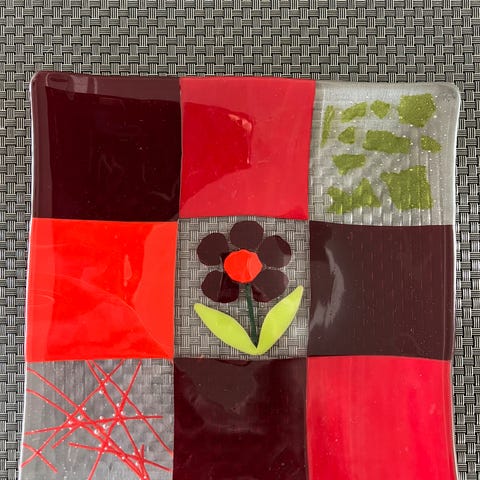 Glas, Glaskunst, Glasplade, Glaskunstner fra Odder, Glasplade med røde cirkler. Måler 11 x 11 cm. Tykkelse ca 6 mm. Lavet af glaskunstner fra Odder-egnen. (købt på kunstmarked). vægt 170 gr.