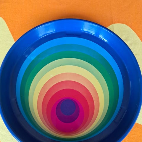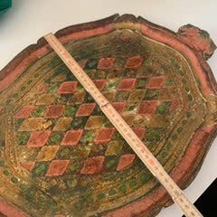 Ø 36,5 cm. H 3,5 cm. Ingen skader dog lidt falmet i rød farve, den har jo også alderen til det.