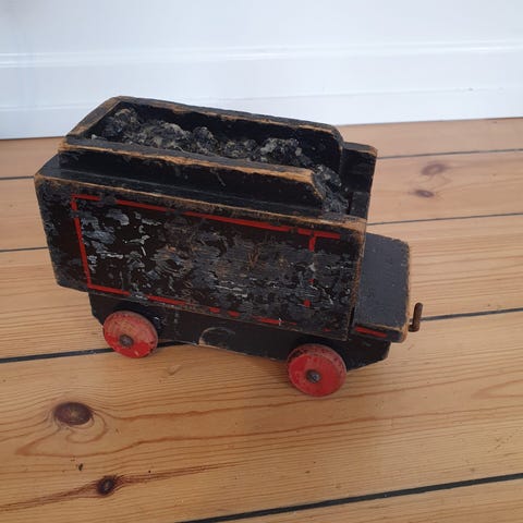 Legetøj, Bambola vogne med klodser, 22 dele vintage Bambola røde, blå og gule vogne og byggeklodser fra begyndelsen af 70'erne. Vognene kan hægtes sammen, og klodserne kan stables på vognene eller bruges hver for sig. Der er snor i den forreste vogn, så man kan trække dem efter sig. Alt meget velholdt og helt intakt.