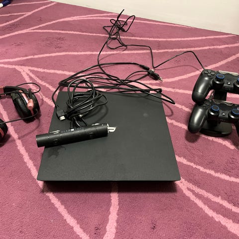 Sony PlayStation 4 spillekonsol med to controllere og kabler