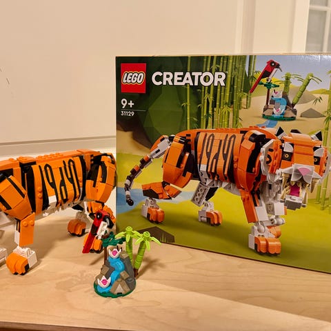 LEGO Creator Tiger byggesæt, der kan bygges som en tiger med orange, sort og hvid farve. Modellen er lavet af LEGO-klodser og kan også ombygges til andre modeller som angivet i 3-i-1 serien.