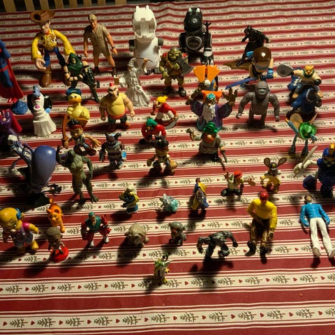 En samling af forskellige actionfigurer og legetøj med varierende størrelser, farver og materialer. Figurenes temaer og designs spænder bredt og inkluderer flere forskellige karakterer og genstande. Egnet til samlere eller til leg.