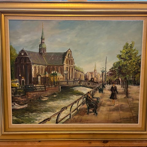 Maleri af et dansk landskab, der viser en bro, et hus med et dansk flag, træer og en sø i baggrunden. Maleriet er indrammet og har ophæng på bagsiden.