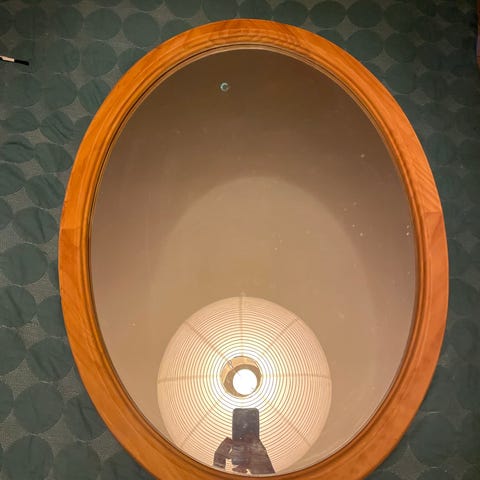 Brugt ovalt spejl... I mørkt træ med brugsspor... Kan evt males i ønsket farve