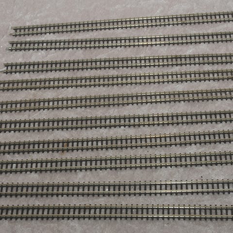 Skinnerne er brugte. De 7 skinner har märklin varenummer 8503, og fremstår næsten som nye. De 4 skinner har Märklin varenummer 8504. De er sat sammen 2 og 2 og loddet sammen på den ene samlelaske, eller ii meget pæn stand.