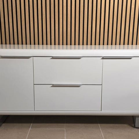 Annoncen gælder kun skænken. Men har været praktisk til TV i soveværelset, da den er passende høj til at ligge ned i en seng og se TV.