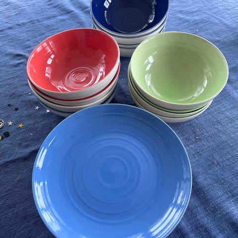 Iittala stellet med tallerkener, skåle og kopper med farvede striber