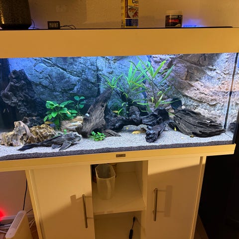 Akvarie Juvel 180 liters på bord, det måler i længden 101 cm og i højden 50,5 cm og i dybden 41 cm, Bordet måler i længden 101 cm i højden 72,5 cm og dybden 41 cm. Højden fra gulv til top er 123 cm. Der går guppyer og suge maller deri. Der medfølger original lys, frostfoder