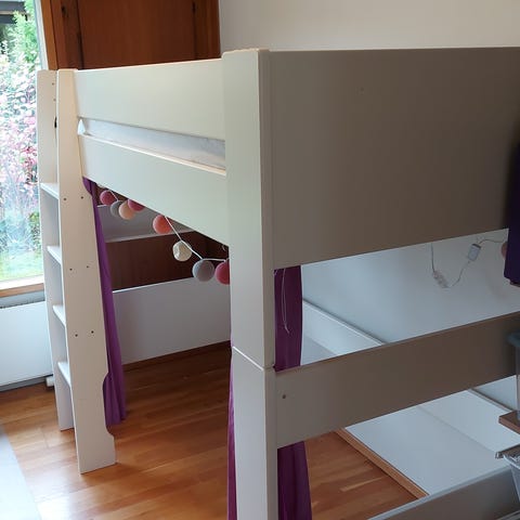 Hjemmebygget børneseng oven på malm kommode.