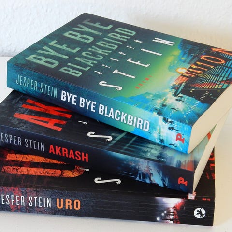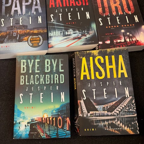 6stk Romaner af Jesper Stein med titlerne Solo, Papa, Bye Bye Blackbird, Uro,Aisha og Akrash