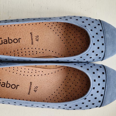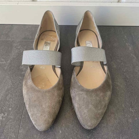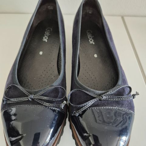 Gabor sort ballerina type med præget laksnude og sløjfe. Stoffet er løst på siderne men ens æøst. så man tror de er sådan. Men deraf prisen. Nypris ca. 800, kr.