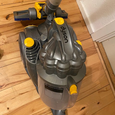 Dyson støvsuger med posefri teknologi. Udstyret med en gennemsigtig beholder til opsamling af støv, flere børstehoveder til forskellige rengøringsbehov, og fleksibel slange. Designet til effektiv rengøring af gulve og andre overflader.