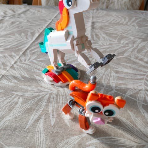 3-i-1 byggesæt med magisk enhjørning, søheste og and. Regnbue. Vi har haft meget sjov med at bygge og bygge om.