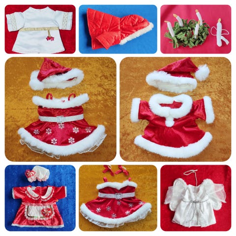 Build-A-Bear bamsepar i juletema med rødt og hvidt tøj, inklusive stribet tøj og nissekostume. Materiale og størrelse er ikke oplyst. Egnet som legetøj eller pynt i julen. Prisen er for begge.
