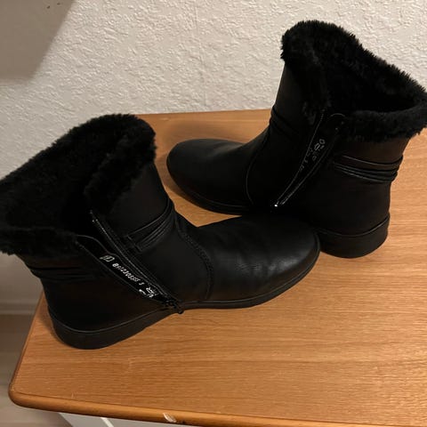 Rieker Vinterstøvler i størrelse 39, sorte. Støvlerne har snørelukning foran og foret med varmt, hvidt materiale indvendigt, velegnet til vinterbrug. Sål med mønster for bedre greb.