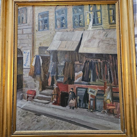 Maleri der forestiller en gade med flere personer og et æsel. Maleriet er udført i varme farver og viser en arkitektonisk scene med buer og bygninger. Bagpå maleriet ses en skitse eller tegning, der kan indikere kunstnerens arbejdsproces.
