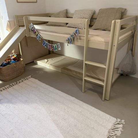 Super pæn og velholdt Flexa halvhøj seng i hvid farve. Står uden diverse klistermærker og lign. Den kan anvendes som både enkeltseng og køjeseng. Materialet er træ, og den har en enkel, funktionel stil. Der følger 3 skuffer med som kan stå under sengen hvis den skal stå som enkeltseng. Madras følger med fra Flexa (Nypris 2.000,-) Både seng og madras er kun brugt meget sparsomt. Mål er 120 cm med stige og sengehest. Er som det sidste billede, med skrå stige. Længden er 200 cm og bredde 90 cm. Nypris for seng 6.500,- fra ny, uden madras. Kommer fra røg og dyrefrit hjem. Kan hentes i Ballerup.