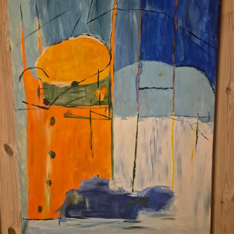 Spændende maleri, akryl, ca. 60x50 cm. Kan hentes i Odense eller evt. Hareskov By.