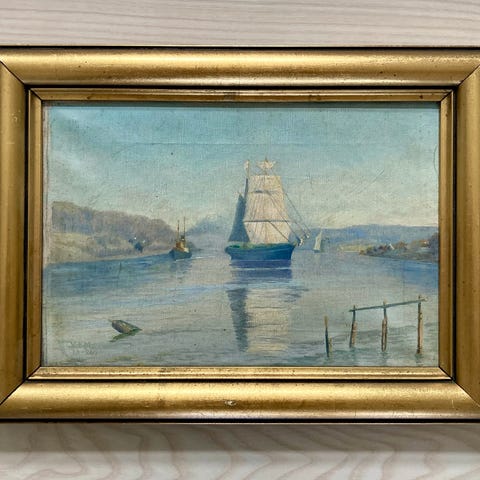 Quistroff (1882-1953) maleri af sejlskibe i frisk vind malet i 1929. I solid og original guldfarvet ramme. Populær dansk marinemaler også kaldte "Mønjemaleren" fordi han var fascineret af rustpletter på skibene.