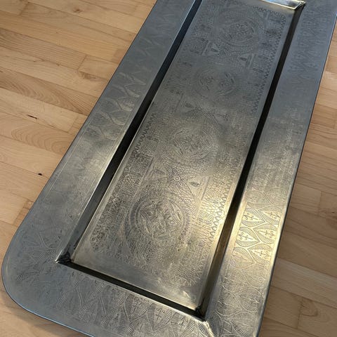 Fin indisk metalbakke med mønster og patina.