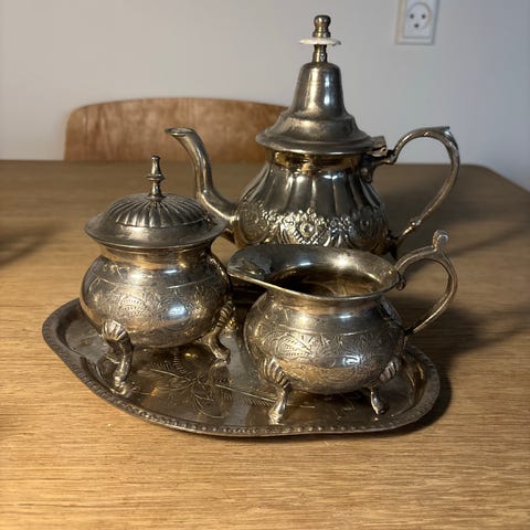 Sættet består af to dele med håndtag, designet til servering af fløde og sukker.