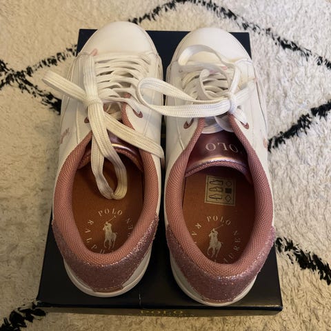 RL NY hvid sneaker med sort bånd på siderne med RL logo i guld-farve.