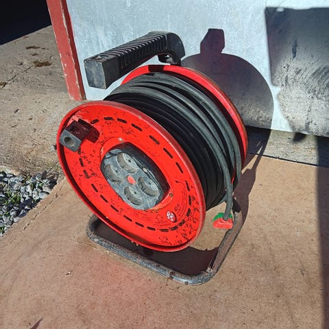 Jogo Kabeltromle med mærkning for 250 V og 4 Amp. Kabeltromlen er rød og har en metalramme. Velegnet til elektrisk udstyr med lavt strømforbrug.