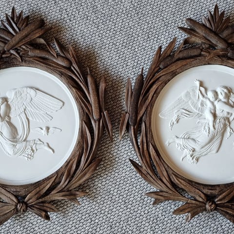 Stor basrelief modelleret af Bertel Thorvaldsen, (1770-1844), på Nysø 24.12.1842, 32½ cm. i diameter. Mat, hvid, Bisquit / biscuit / biskuit - fabriksmærket er stemplet ‘B&G - Eneret’ bagsiden under huller til ophæng. Katalognummer A589 på Thorvaldsens Museum.