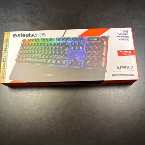 Steelseries Apex 7 mekanisk tastatur i sort farve. Tastaturet har mekaniske taster med røde kontakter, hvilket giver en lineær og lydsvag skriveoplevelse. Det er designet til brugere, der ønsker præcis og hurtig respons ved tastetryk. Tastaturet har et robust design og inkluderer et håndledsstøtte for øget komfort ved længere tids brug. Der er kun støv på den. alt virker på tastaturet har kassen til den. Kom med et bud