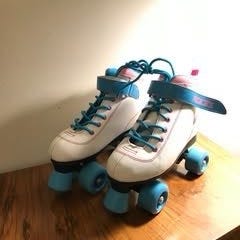 Side by side rulleskøjter i størrelse 27-30, designet til børn. Skøjterne har en kombination af hvid og turkis farve.