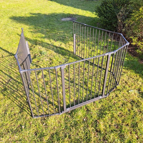 Sort sikkerhedsgitter i tre led med låge. Fungerer upåklageligt og står flot.
