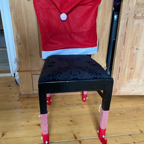 Disse stolebetræk er lavet af polyesterfilt i høj kvalitet og er behagelige og varme at læne sig imod. De er søde med nissehuens kvast på bagsiden. Betrækkene glider nemt ned over dine stole uden armlæn og dækker dem både foran og bagpå.