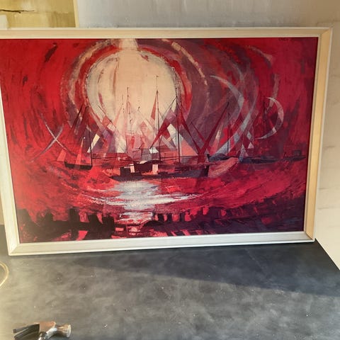 Carlo Romberg maleri med abstrakt motiv i røde nuancer. Maleriet er indrammet og signeret af kunstneren. Velegnet til vægophæng i bolig eller kontormiljø.