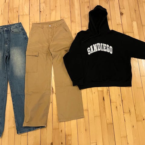 Brun hoodie, der kan strammes ved hætten, 2 par lange sorte bukser, en sort sportstrøje med plads til at stikke tommelfingeren ud, samt en blå-grøn kjole med en papegøje på.