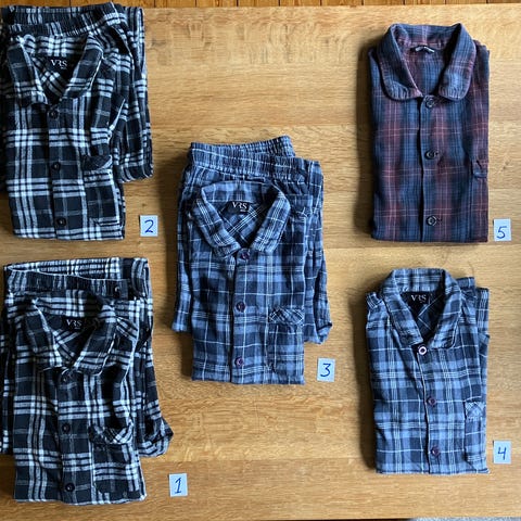 Diverse pyjamas i bomuld, alle i god stand. Blå ternet. Størrelse M.