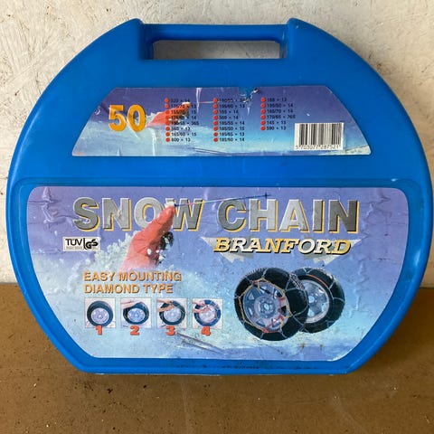 Snow Chain Gr. 12 med kæder på 9 mm til montering på bilhjul. Leveres i opbevaringskasse med monteringsvejledning og tilbehør.