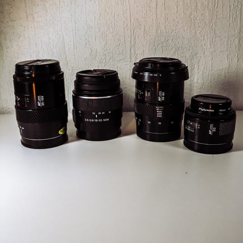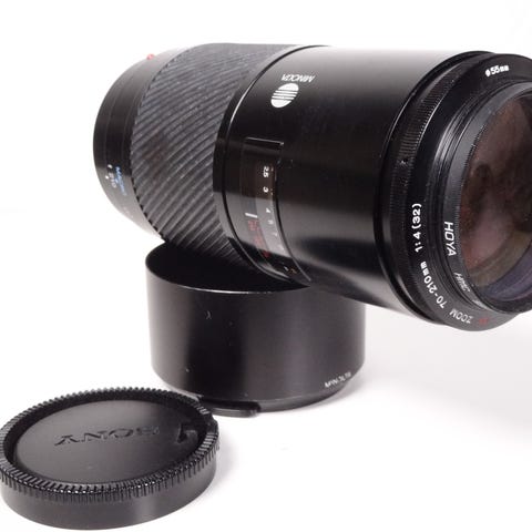 Minolta 28-135 med macro. Et rigtig lækkert objektiv, men tungt. 800 gram. Lysstærkt og meget skarpt glas. Med autofocus. Lidt et 'libhaver' glas for kendere, der ikke vil give det hvide ud af øjet for en 28-135 mm., men gerne vil bære et kilo extra for kvalitet. UV filter og kapsler medfølger. Sendes gerne.