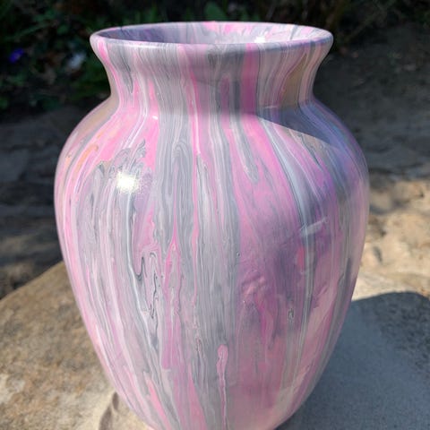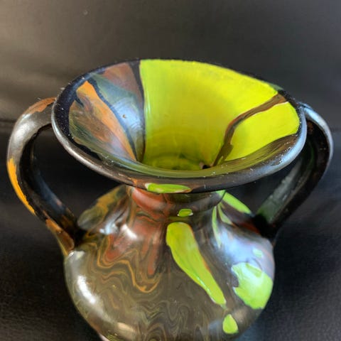 Jeg har selv malet krukken ( grunder, akrylmaling og flere lag lak). Recycling. Sorte, orange og grønbrune farver, metoden Pouring og 19 cm høj