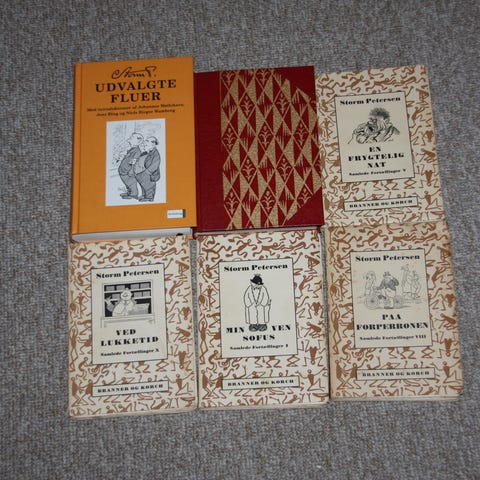 Bind 1, 2, 3, 4, 5 og 7 af Storm P.s samlede fortællinger. Titlerne er Min ven Sofus, Det ordner sig, Man ved aldrig noget, Ned med alting, En frygtelig nat og Ølfus. Branner og Korch uden årstal. Bøgerne er på omkring 160 sider. Illustrerede. Billigbøger. Prisen er den samlede pris for alle bøgerne. Sendes gerne. Køber betaler porto
