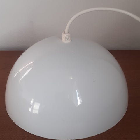 Den originale emaljerede model i flot orange farve og med den orinale stofbetukne ledning.Stort set perfekt (jeg kan ikke finde nogle mangler) og i samme families eje siden 1983. Selvfølgelig fra røgfrit hjem uden børn og hunde. Den måler 216 mm på skærmens bredeste sted.Jeg leverer i Ry og Odder, og ellers er det selvafhentning i Ry.