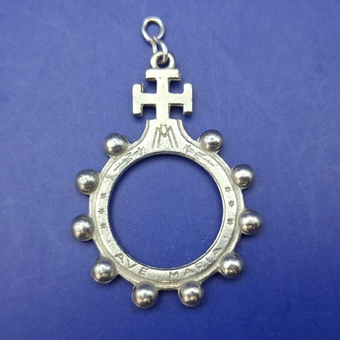 Vedhænget måler ca. 2cm*1,3cm . Rosenkrans ringen er lavet af noget sølvbelagt metal - muligvis messing eller bronze. Sølvbelægningen er lettere slidt.