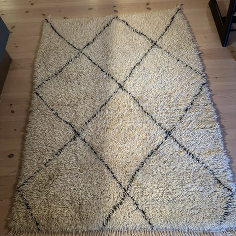 Beni Ouarain-berbertæpper, håndknyttet i Atlasbjergene, Marokko. Med en lys bund og grafiske mønstre i brun er tæppet unikt og lavet af 100 % fåreuld, rig på naturlig lanolin for nem vedligeholdelse. De bløde, nedtonede nuancer passer perfekt til nordisk minimalisme og skaber varme og harmoni i rummet.