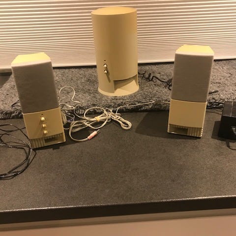 Super lækkert Bose højtalersystem inkluderer to satellithøjtalere, en subwoofer, en central enhed og en fjernbetjening. Systemet er designet til at levere lyd til hjemmebrug og har kabler til tilslutning af enheder. Farven på enhederne er sort.