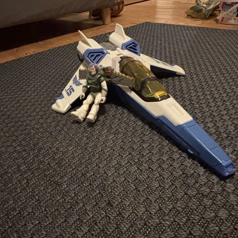 Buzz lightyear i en flot flyvende udgave som en figur der betjenes via en ledningstilkoblet fjernbetjening. Er købt i Disney land Paris. Tryk på dem grønne knap, og Buzz Lightyear flyver. Han er lavet i samme materiale som en lille drone, en slags papmache og vejer derfor ingenting. De små propeller på buzz lightyear løfter figuren flot op og holder den flyvende. Let at betjene, også for mindre børn. Er helt ufarlig og sjov at se flyve. Bruger 4 stk AA batterier. Sælges for kun