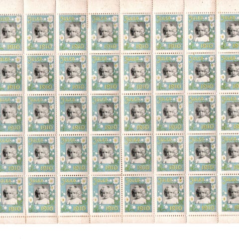 Juleark fra 1910. Let bukket. Tape på bagsiden fler forskellige steder (se scan) fordi den er gået lidt op i takkerne. Ellers et pænt ark i betragning af dets alder.