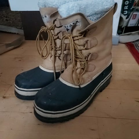 Beige vinterstøvler i størrelse 41 med snørebånd og gummisål. Skoene har en let polstret krave for ekstra komfort. Materialet er ikke specificeret, men skoene har en robust og slidstærk sål med et mønster for bedre greb. De er super dejlige at have på og er i et godt og slidstærkt materiale. De har lette brugsspor, som ses tydeligt på billederne...derfor den lave pris. Købt sidste vinter og har kun haft dem på 4-5 gange, før jeg fik nogle andre i gave, nypris; 899,-