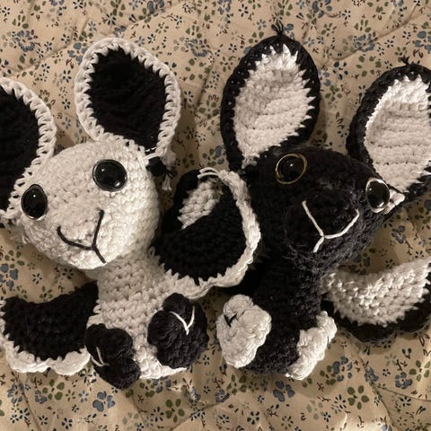 håndlavede hæklede bamser designet som Spiderman. Små figurer jeg har i overskud