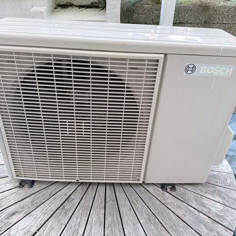Bosch luft-til-luft varmepumpe system bestående af en indendørsenhed, en udendørsenhed og en fjernbetjening.